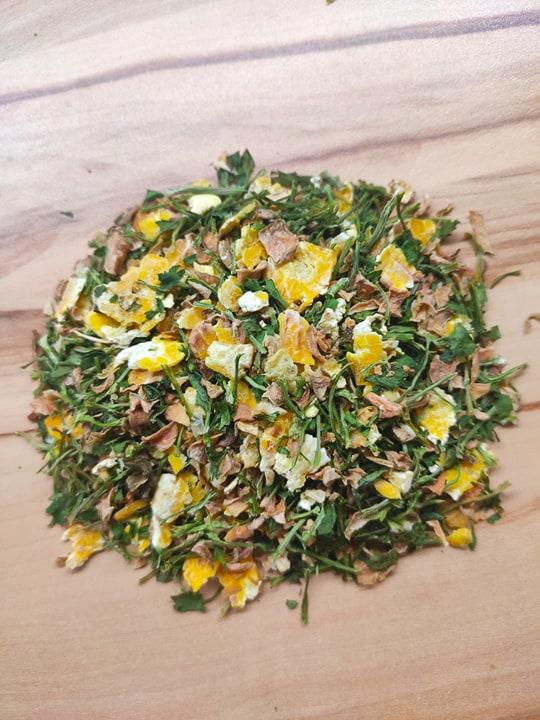 Extruze kukuřice umožní její lepší využití. Mrkev obsažená ve směsi s krásnou vůní a sytou barvou je vysušena přirozeným pochodem tak, aby zůstaly nedotčeny všechny účinné látky v ní obsažené. Takový postup pomáhá udržet vysoký obsah betakarotenu. Sušená petržel dodá v krmné dávce přísun množství vápníku ale také vit. C. Vhodné pro doplnění jídelníčku, chutné, při váhovém úbytku.