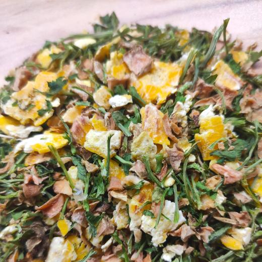 Extruze kukuřice umožní její lepší využití. Mrkev obsažená ve směsi s krásnou vůní a sytou barvou je vysušena přirozeným pochodem tak, aby zůstaly nedotčeny všechny účinné látky v ní obsažené. Takový postup pomáhá udržet vysoký obsah betakarotenu. Sušená petržel dodá v krmné dávce přísun množství vápníku ale také vit. C. Vhodné pro doplnění jídelníčku, chutné, při váhovém úbytku.